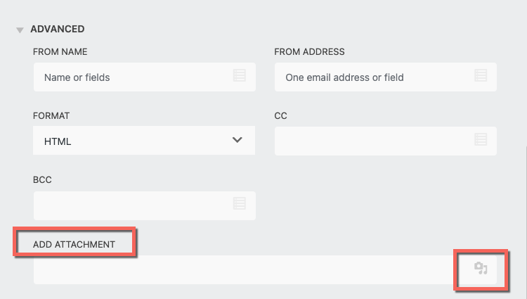 One way of sending an ebook can be done through the attachments field for your email action. To add an attachment from your WordPress media library open the Advanced dropdown and click on the Attachment icon. Doing so will add the attachment to your email notification.