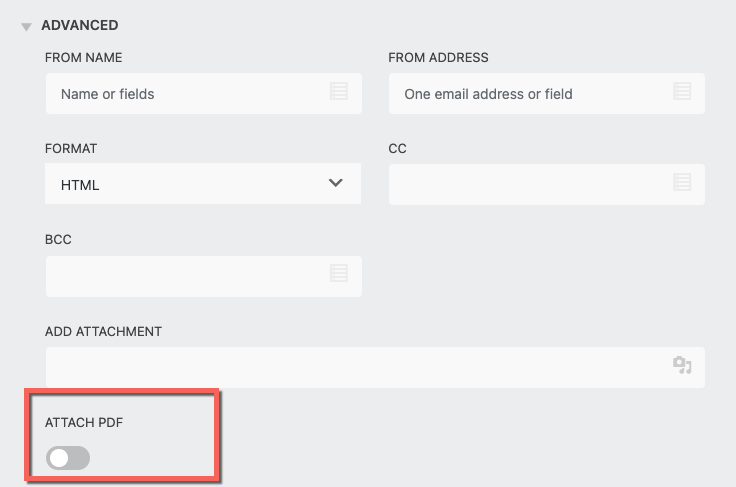 The PDF Form Submissions add-on comes with a feature that gives you the option to attach submissions as PDFs. Once the add-on is installed and activated head over to your email action, open the Advanced dropdown, and toggle on the Attach PDF button. For more information check out our article, on Exporting your PDF with WordPress.