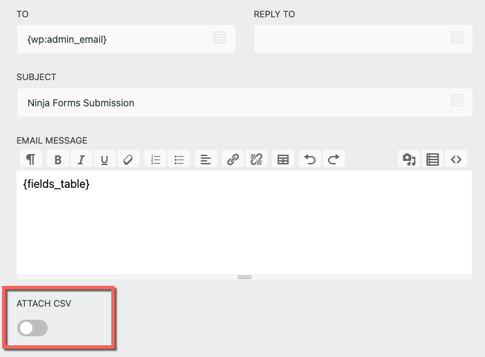 Send submissions by enabling the Attach CSV toggle switch. Doing so will attach the latest submitted entry in a CSV format.