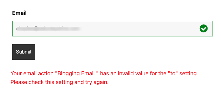 When you see, “Your email action [action name] has an invalid value for the [setting name] setting. Please check this setting and try again. when the WordPress Form is Submitted” error. Re-Check the address you have entered into these fields, oftentimes, the email address entered does not exist.