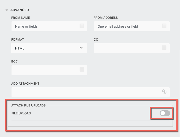 To attach file uploads to your email action, add the File Uploads field to your form ( must have the File Uploads add-on ) then, Publish and refresh. Open the email action and look under the Advanced drop-down and you should now see an option to toggle your file upload on or off.