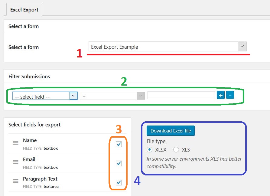 Excel Export allows you to assign certain form fields to the desired cell, row, or column in a .xlsx or .xls spreadsheet. You have total control, able to set the form submission date range, exempt unnecessary form fields, choose your file type and more.