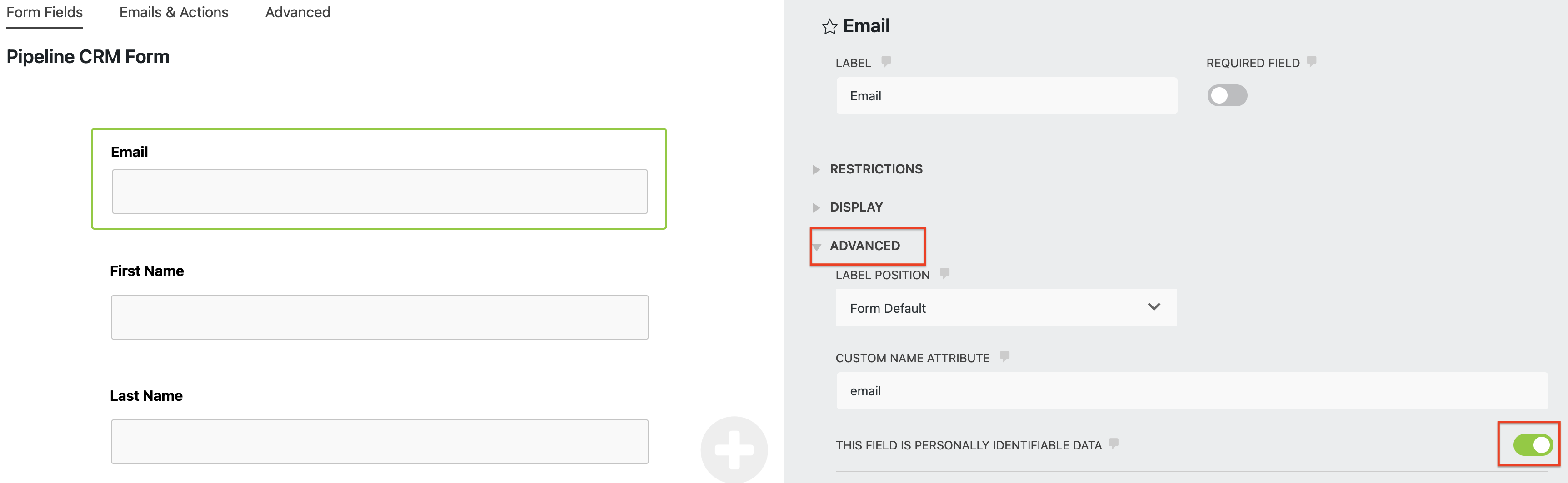 Now enable any form fields you want to be anonymized. Toggle the THIS FIELD IS PERSONALLY IDENTIFIABLE DATA button under the Advanced setting to anonymize the data. By default, all User Information fields are set as personally identifiable data.