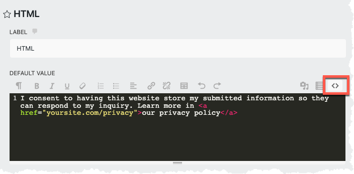 Customize the text as needed, but ensure you update “yoursite.com/privacy” with your actual privacy policy link. Add a Checkbox field and make it required. Doing this will prevent data from being submitted unless it was explicitly granted.