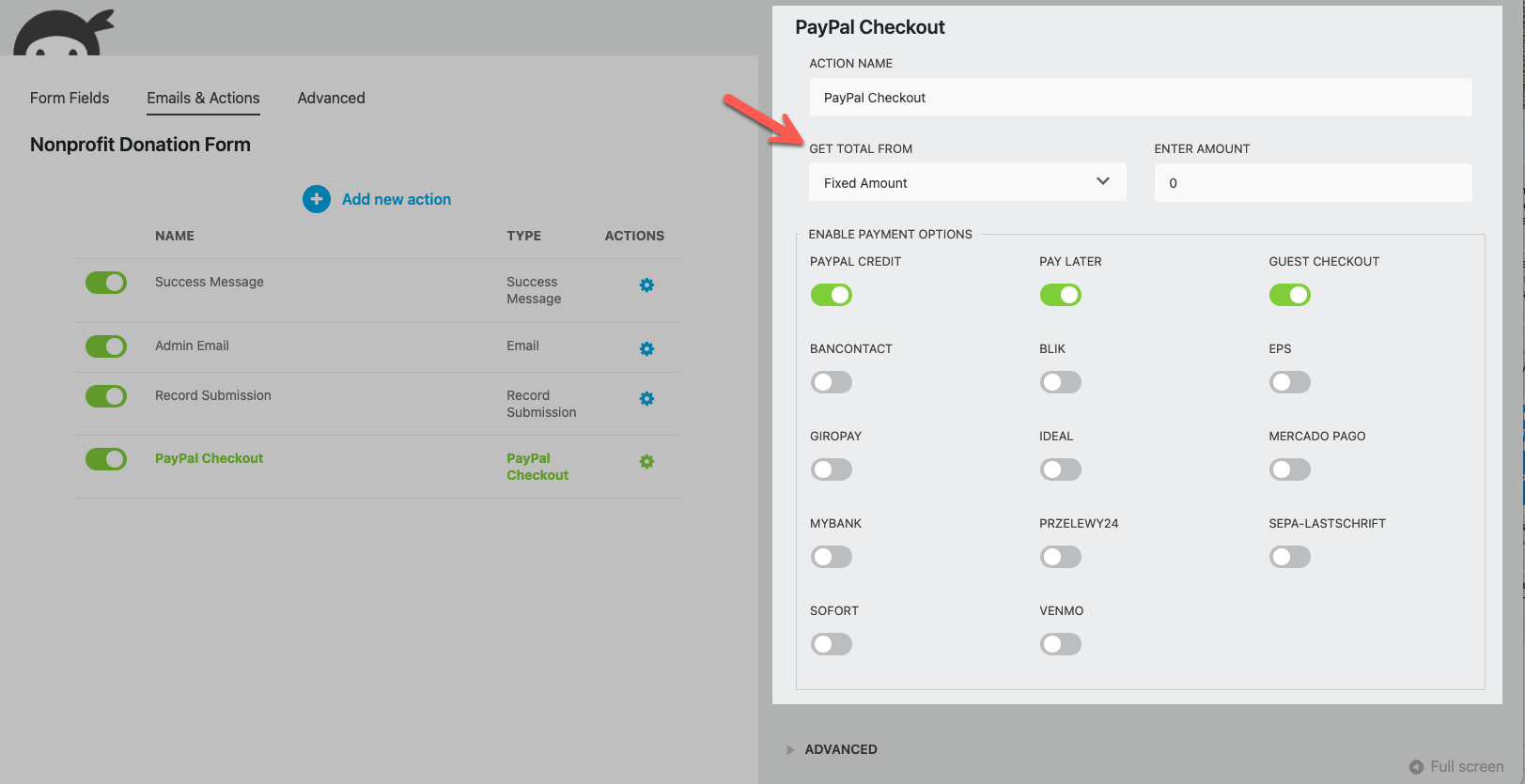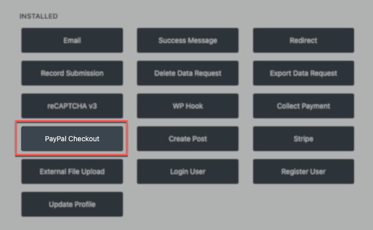 After you click on it, you will see the PayPal Checkout action along with the list of our enabled form actions.