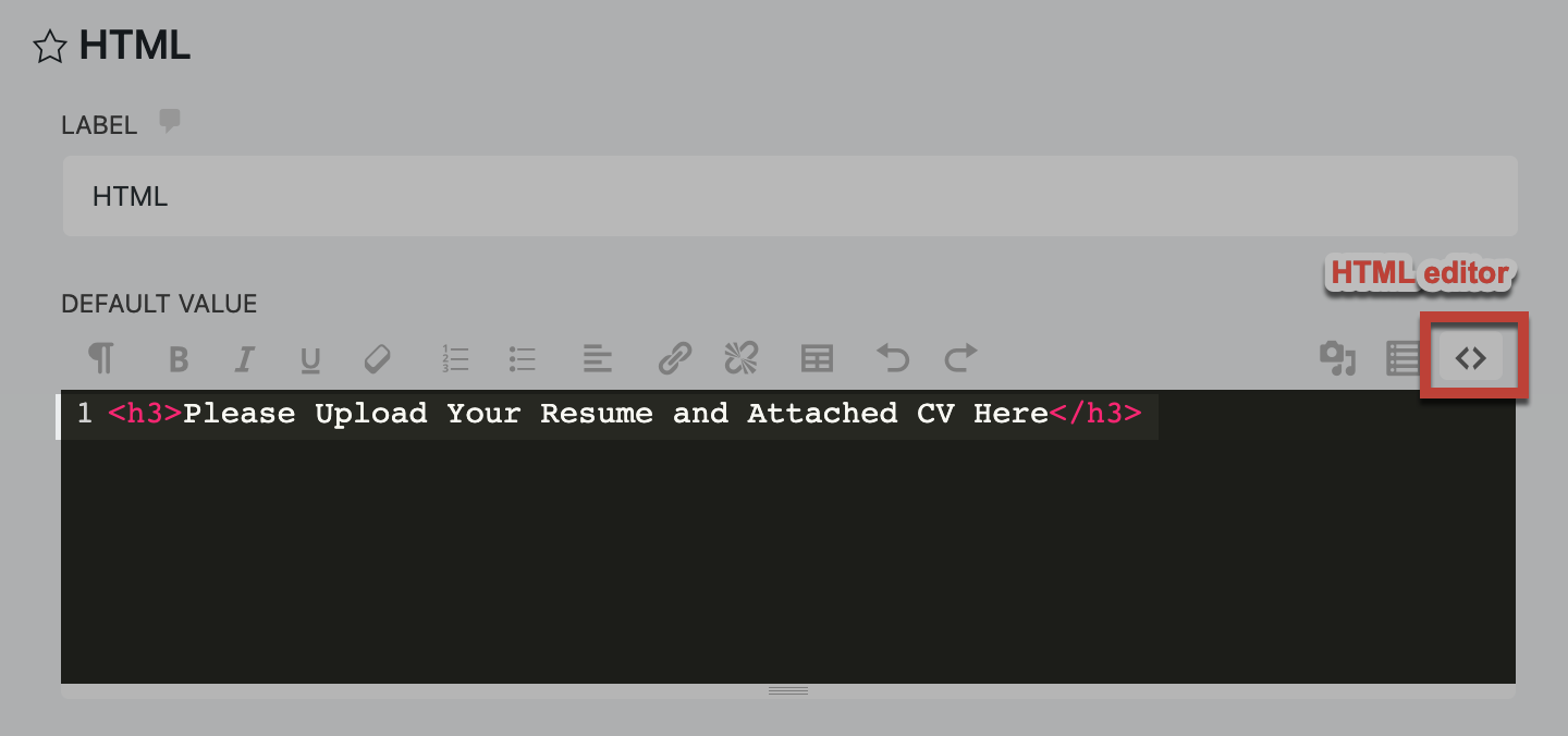 Begin by adding an HTML field for instructions. For instance: “Please Upload Your Resume and Attached CV Here” in a <h3> format.