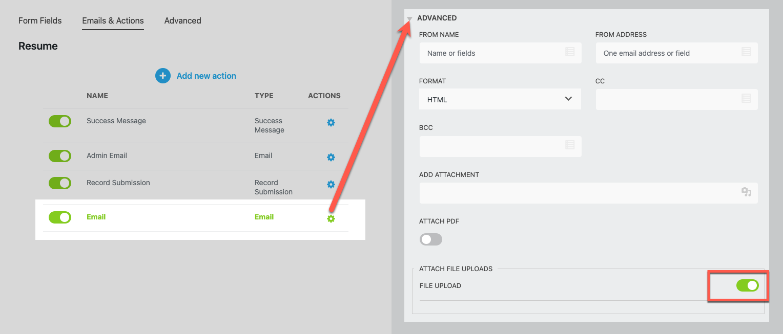 Both of these are possible within the Ninja Forms actions system. Head to the Emails & Actions tab of your form builder, and you’ll see where you can create an Email action. Create one for your resume upload form, and you’ll get email notifications going out to each team member who needs to see a new application.