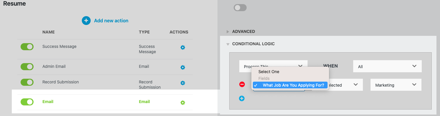 What if you’ve got multiple job openings and need certain resume uploads to go to specific individuals and other uploads to a different set of people? You can do that, too, using Conditional Logic to send emails conditionally to only specific parties.