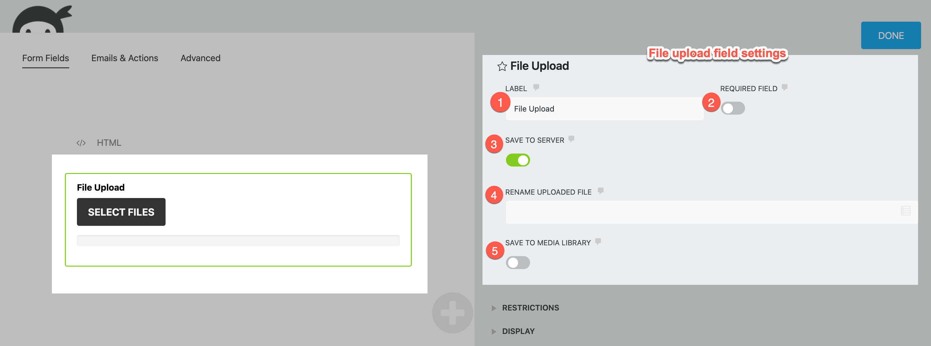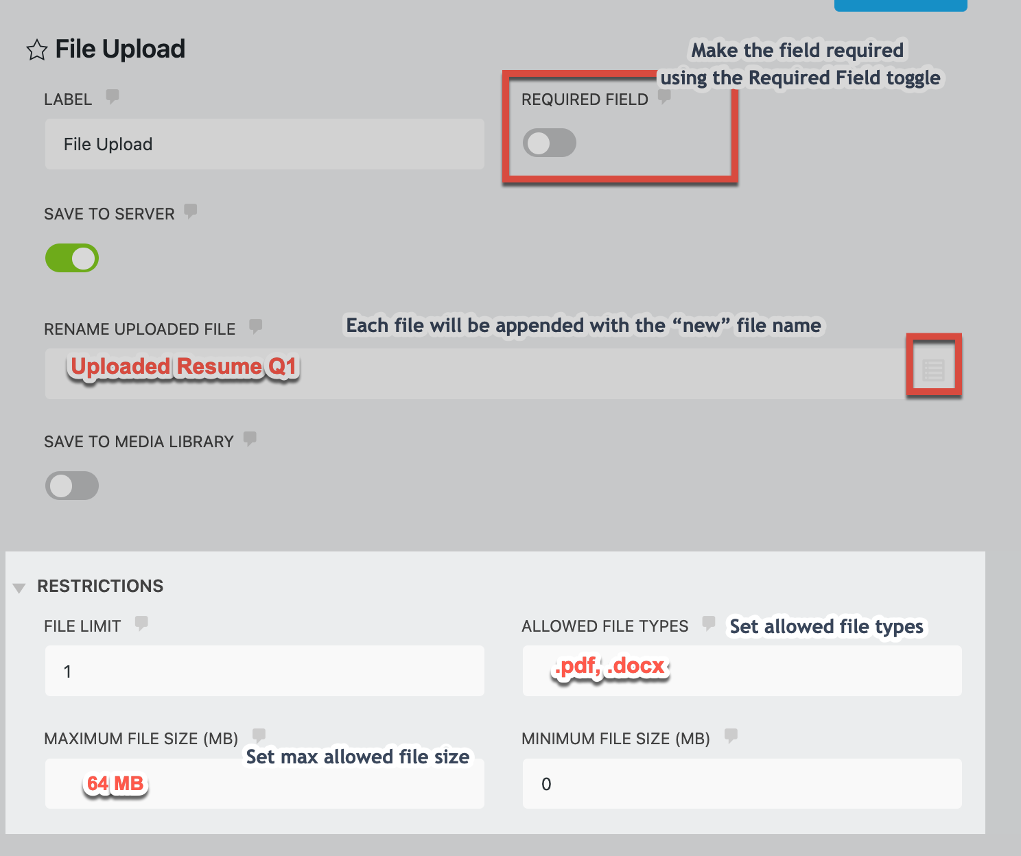 Customize restriction settings, such as renaming uploaded files, setting file size limits, and specifying acceptable file formats.
