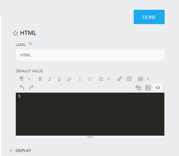 The HTML field will literally become our button. Just add it to your form wherever you want the button to appear, and in the toolbar above the rich text editor, click the <> icon. This toggles us over to a part of the editor where we can directly input HTML and CSS. You should be looking at this: