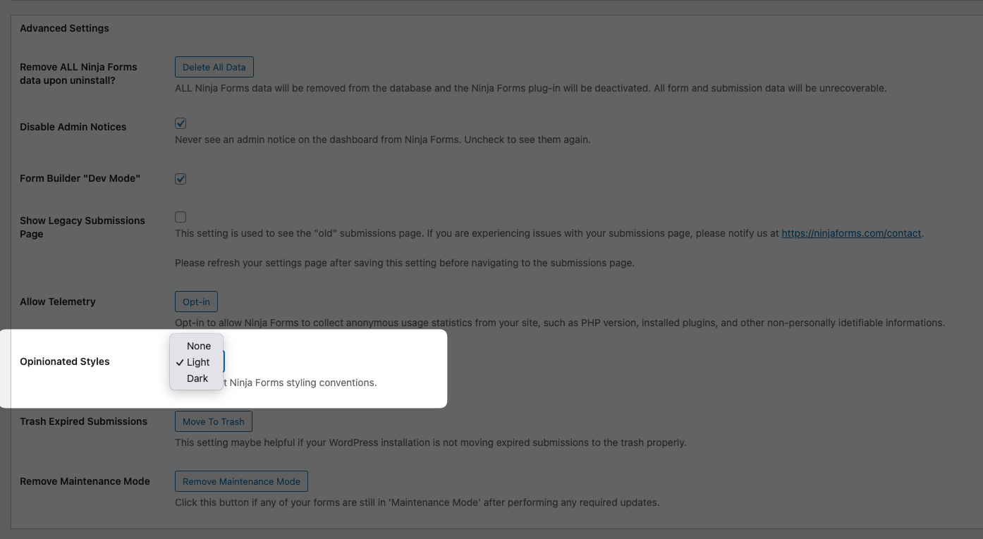 Navigate to Ninja Forms > Settings > Advanced Settings > Opinionated Styles and select Light or Dark from the field option.