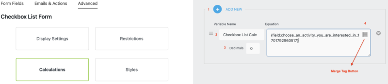 Lastly, head over to the Advanced tab > Conditional Logic and click Add New Condition. Here you can select the Hidden field wich presents the Checkbox List calculation. We selected trigger condition to Greater than 4, as we don’t want to allow users to select more than 4 options from the checklist.