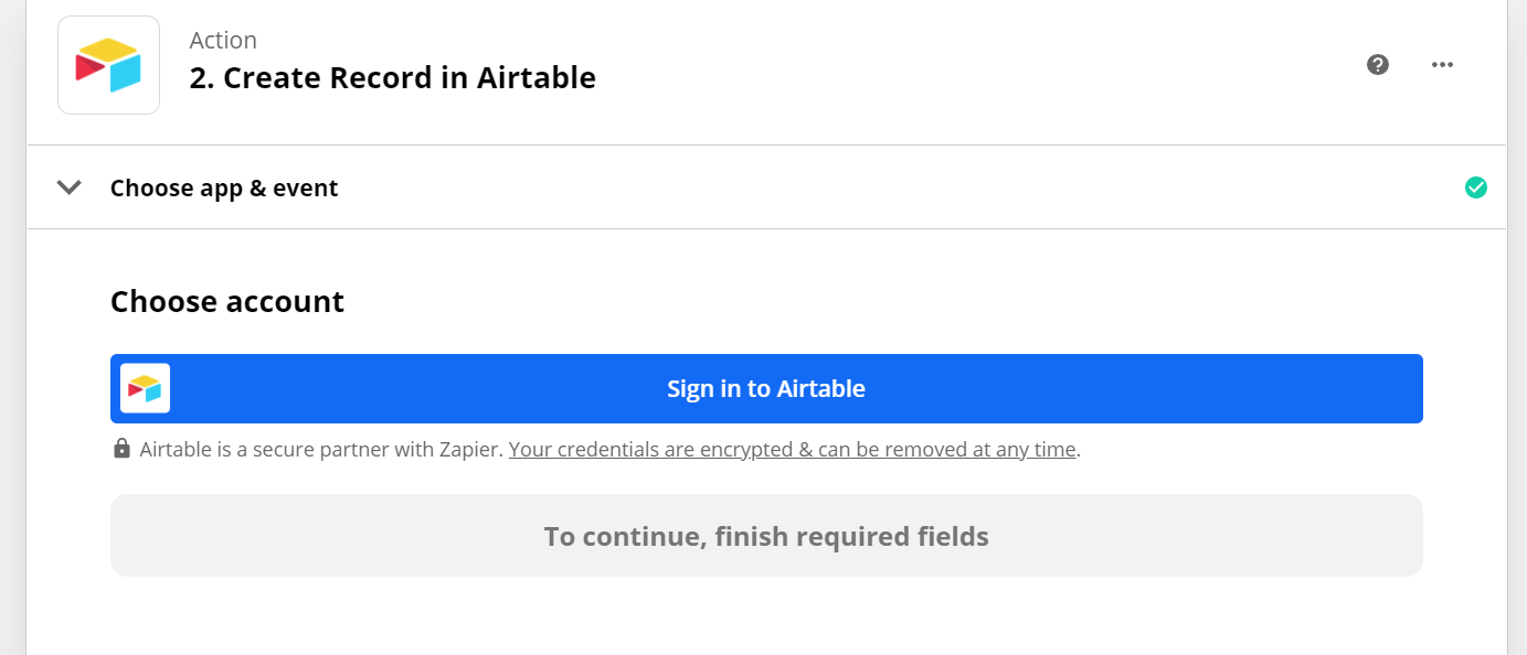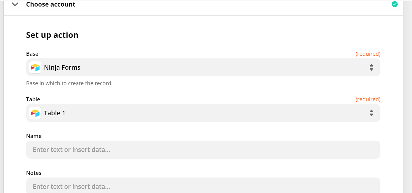 Having successfully integrated your Airtable account, you can now select that account in Zapier and proceed. You’ll be greeted with your Airtable fields within Zapier.