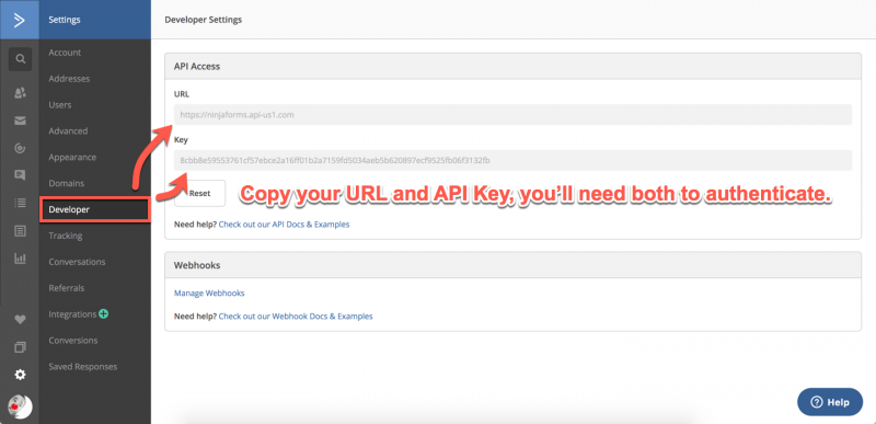 Once in the Settings area, click on the Developer tab from the left. Note and copy the URL and Key values within the API Access area. You’ll need them for the next step.