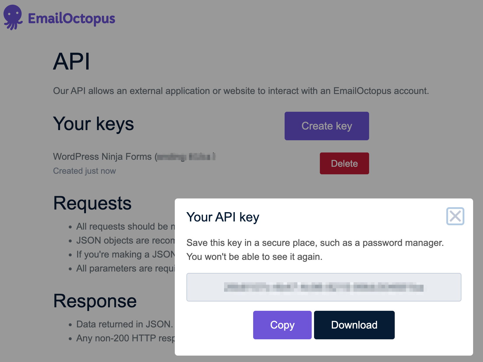 Your API key will display along with options to Copy or Download the key. Make sure you save it and secure this key as it won’t show again in your account.