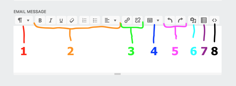 1. This gives you a handy dandy dropdown to auto-add different HTML like paragraph text, block quotes, and headers. Just highlight a segment of text and select the option of your choice. Easily create headings and subheadings for different section of the email here.