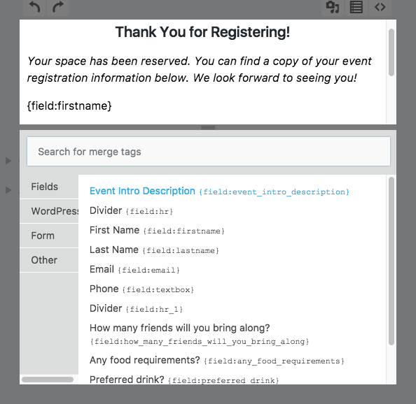 Let’s format the email so that it’s organized in a similar fashion. Users don’t need to see the event intro repeated in a confirmation email, so we can change that text to something unique. We can then present the rest of the info in sections with a line break, just like the form.