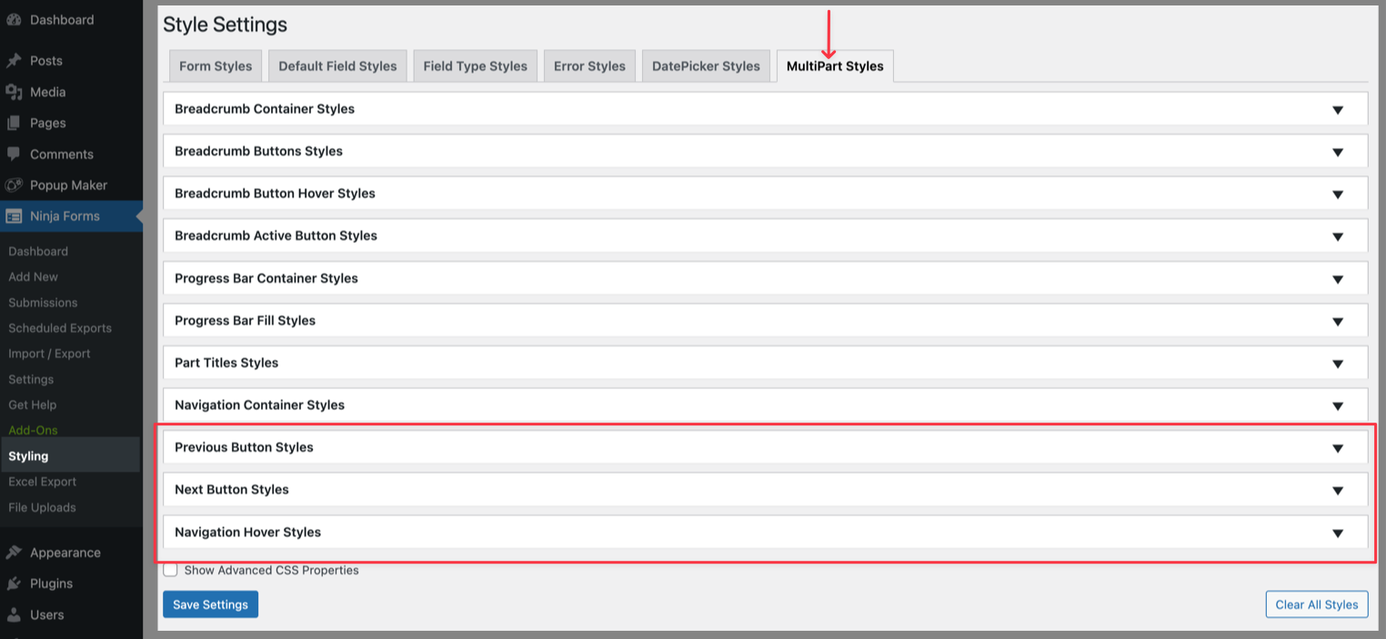 Click on the MultiPart Styles tab to reveal the customization settings for your Multi-Step forms. You should see the following sections: