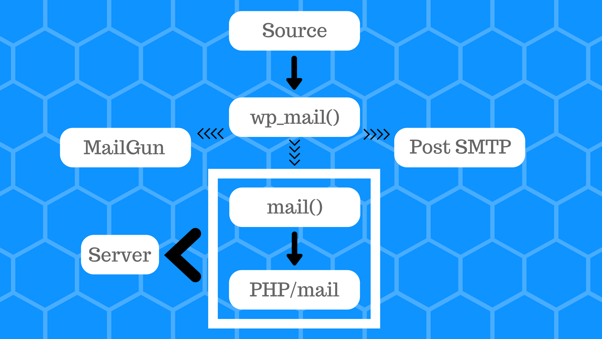 Alternatively, you may elect to use a SMTP plugin or transactional email service to send email in place of your host. That’s illustrated by the branches of the image going off to the left and the right: Mailgun (a transactional email service) to the left, and Post SMTP (a SMTP plugin) to the right. Either will screen and process your email itself, and then send it out to its destination.