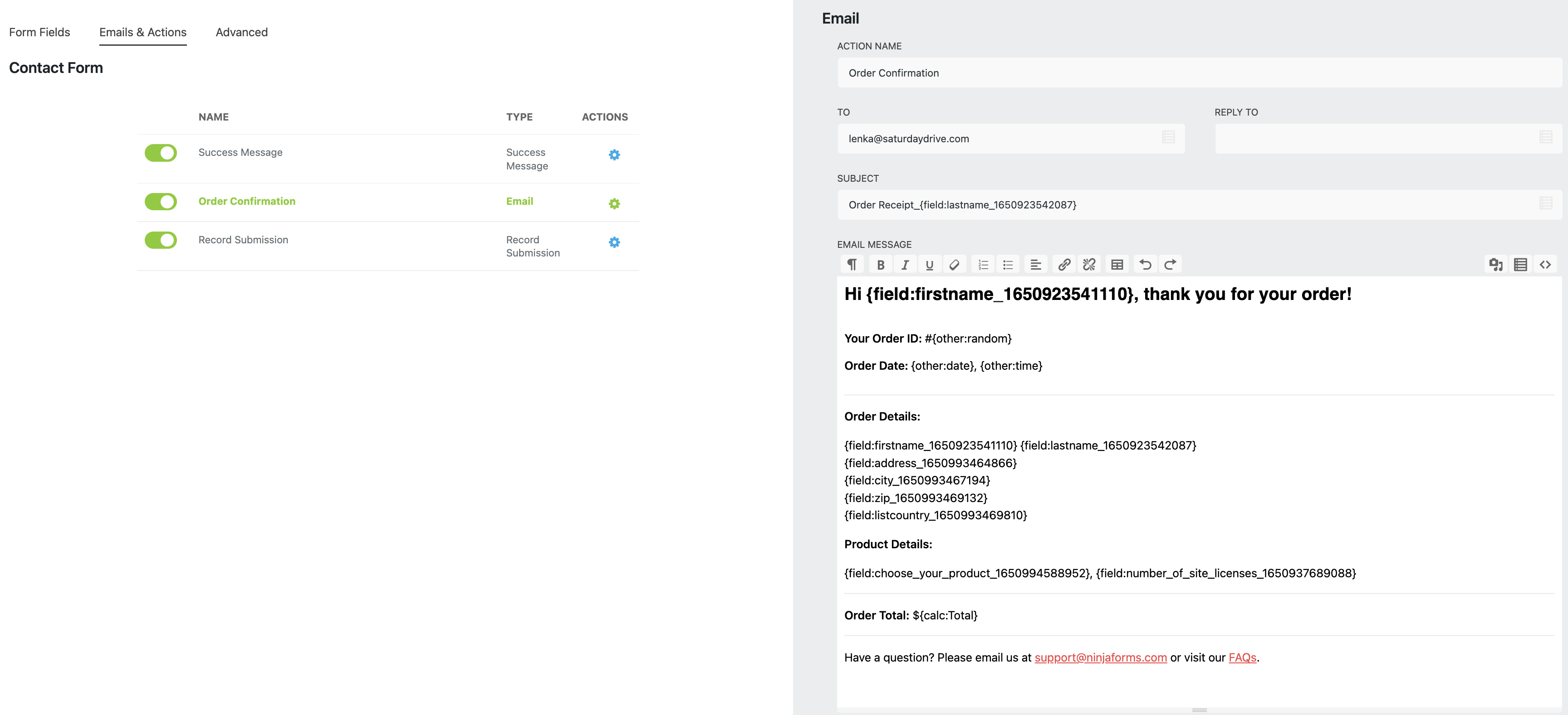 With Ninja Forms, you have a number of options at your fingertips for generating simple order email receipts. Whether you need a simple email receipt, a downloadable pdf, or a custom bill of sale sculpted to a very specific format, we have you covered. Read on to see your options!