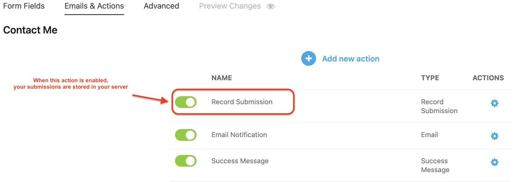 If you want to store received submission data on your website (your servers in WordPress), enable the Record Submission action.