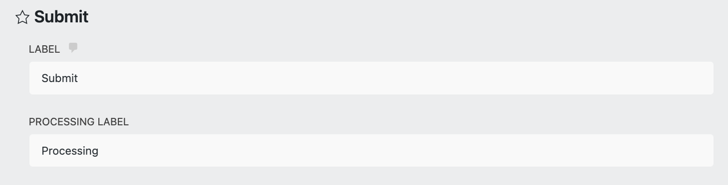 By default, when the user clicks the Submit button, the label will change to “Processing”. You can also rename this processing label to something that better suits your needs.