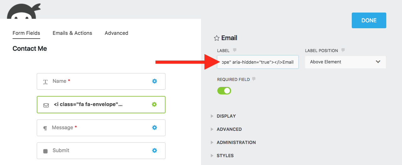 Like I said previously, we’ve done most of the work for you. All you really have to do is find the icon you want, and copy and paste it where you want it. Let’s do an example by placing an envelope icon in the label of an Email field. You can use the same technique to have a Font Awesome icon appear virtually anywhere in your Ninja Forms.