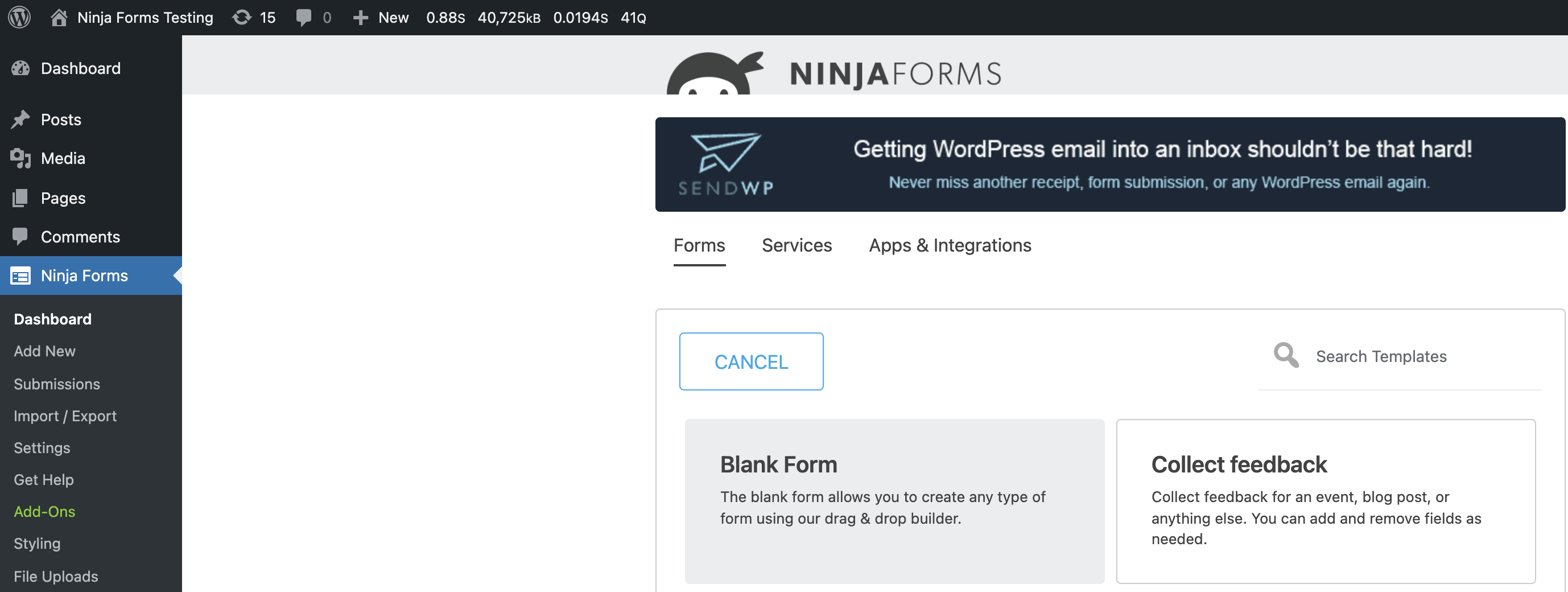 Once you installed our form builder, click Add New under the Ninja Forms menu in your WordPress dashboard. Here, you can choose from our free pre-built templates, or you can build your form from scratch by selecting the Blank Form template. For more details, you can visit our tutorial on Building a Form.