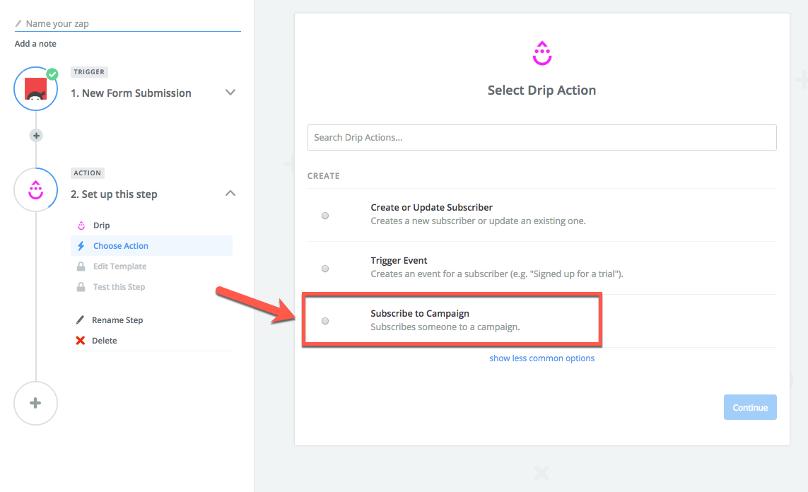Setting up your Action App is very similar to the Trigger App we setup above. Search and select Drip the same way we did Ninja Forms in the previous step. Once you’ve selected Drip, you’ll have the option of either Creating/Updating a Subscriber, Triggering an Event, or Subscribing a user to a Campaign: