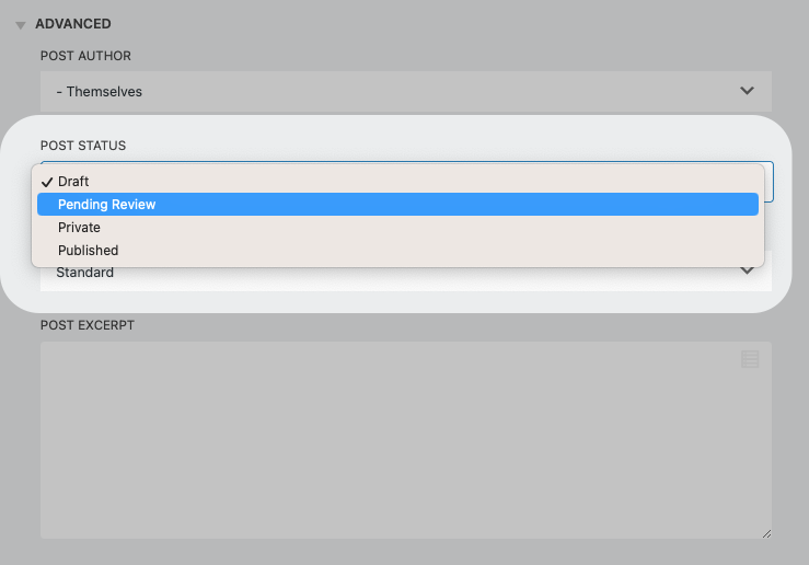 To ensure posts are reviewed before publishing, change the ‘Post Status’ to ‘Pending Review.’ From a contributor’s perspective, ‘Draft’ indicates the post is still being worked on, while ‘Pending Review’ signifies it’s ready for review. Both statuses prevent the post from being published immediately, allowing you to choose the best workflow for your team.