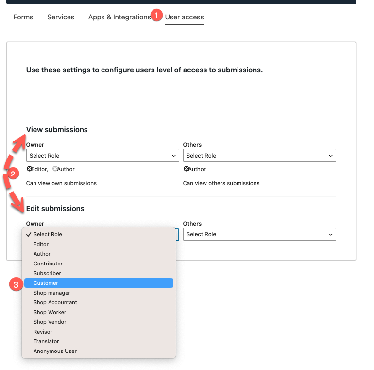 Boosting engagement and enhancing user experience is simple – allow users to edit their form submissions. By installing the Ninja Forms User Management add-on, you can easily manage user access. Navigate to Ninja Forms > Dashboard > User Access, and select the user roles that can view or edit submissions.