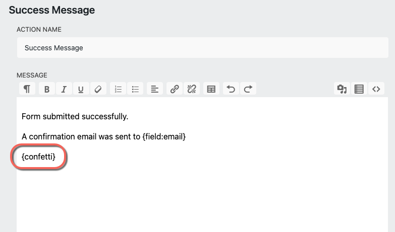 The {confetti} merge tag will only work in the Success Message at the time of this writing, so spare yourself the side-quest and don’t try adding the tag to other actions or hidden fields. It’s not gonna work.