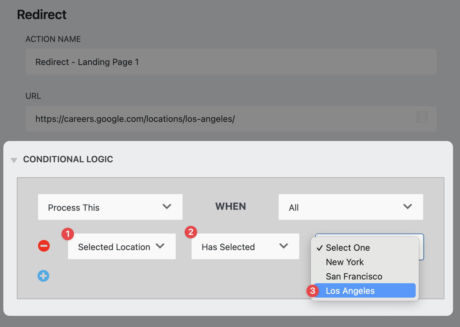 Second, return to the Email & Actions tab, open a Redirect action, and expand the Conditional Logic dropdown. By default, the conditional will be set to Process This WHEN All is selected. Leave as-is.