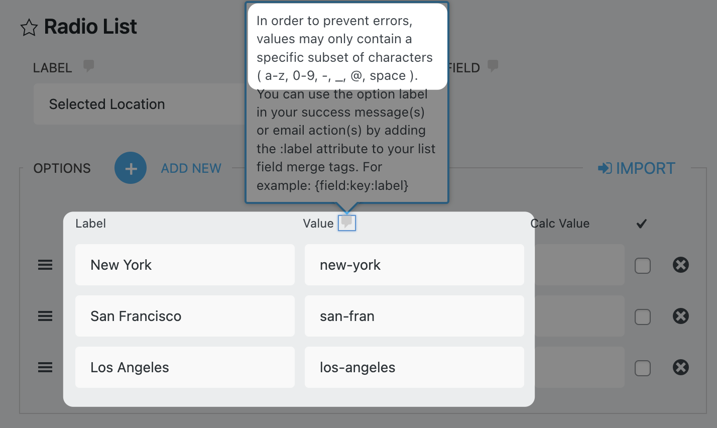 Add the desired field to your form by clicking the blue/circle + icon at the bottom right. Drag-and-drop the field into place. Add a label and value to each option that corresponds with the landing page you want their form submission to be associated with.