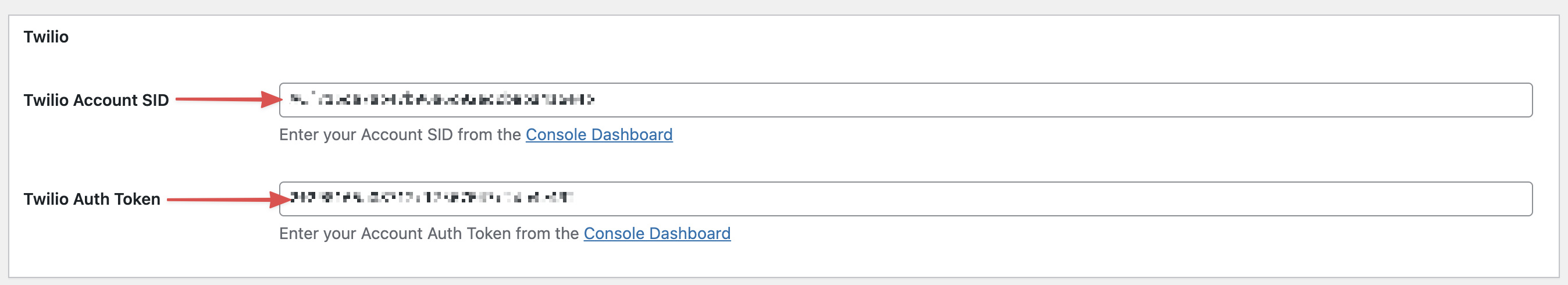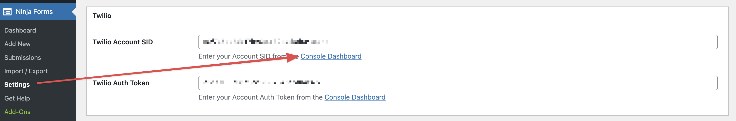 First, Install and activate your Twilio add-on, then head over to your Ninja Form settings. Look for Twilio, and click on the Console Dashboard link.