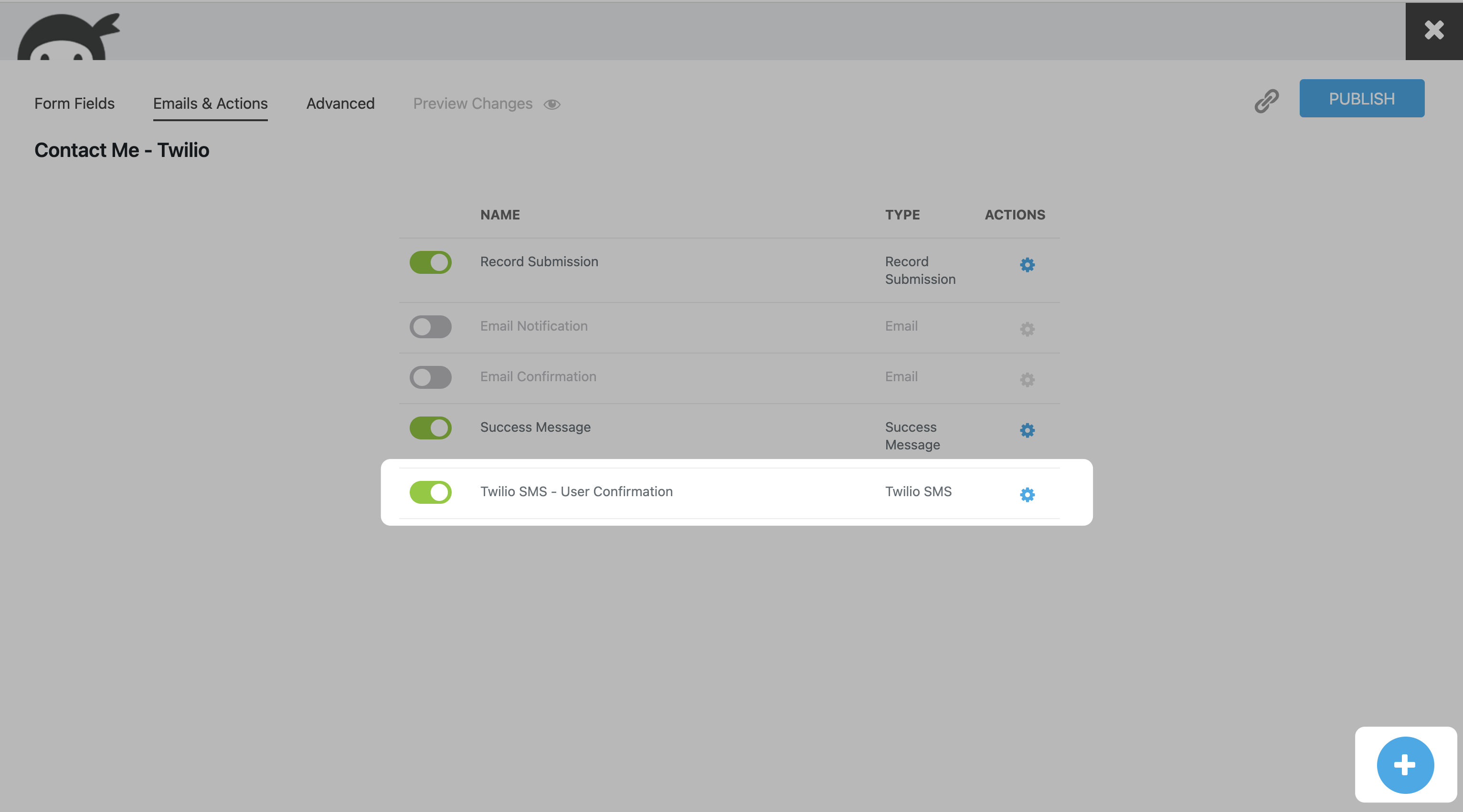 First, add the Twilo SMS action to your form by clicking the blue/+ bottom-right of the Email and Actions tab.
