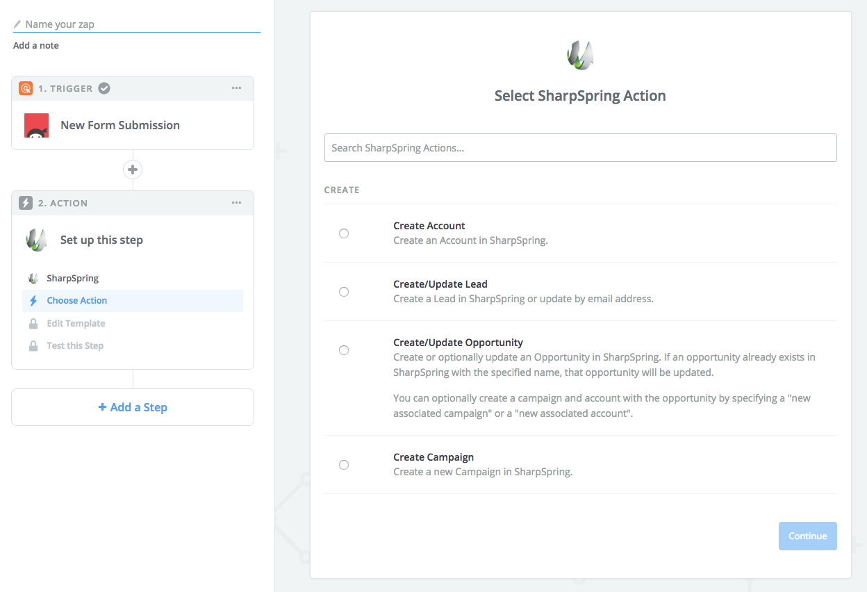 Setting up your Action App is very similar to the Trigger App we setup above. Search and select SharpSpring the same way we did Ninja Forms in the previous step. Once you’ve selected SharpSpring, you’ll have the option of having this form: