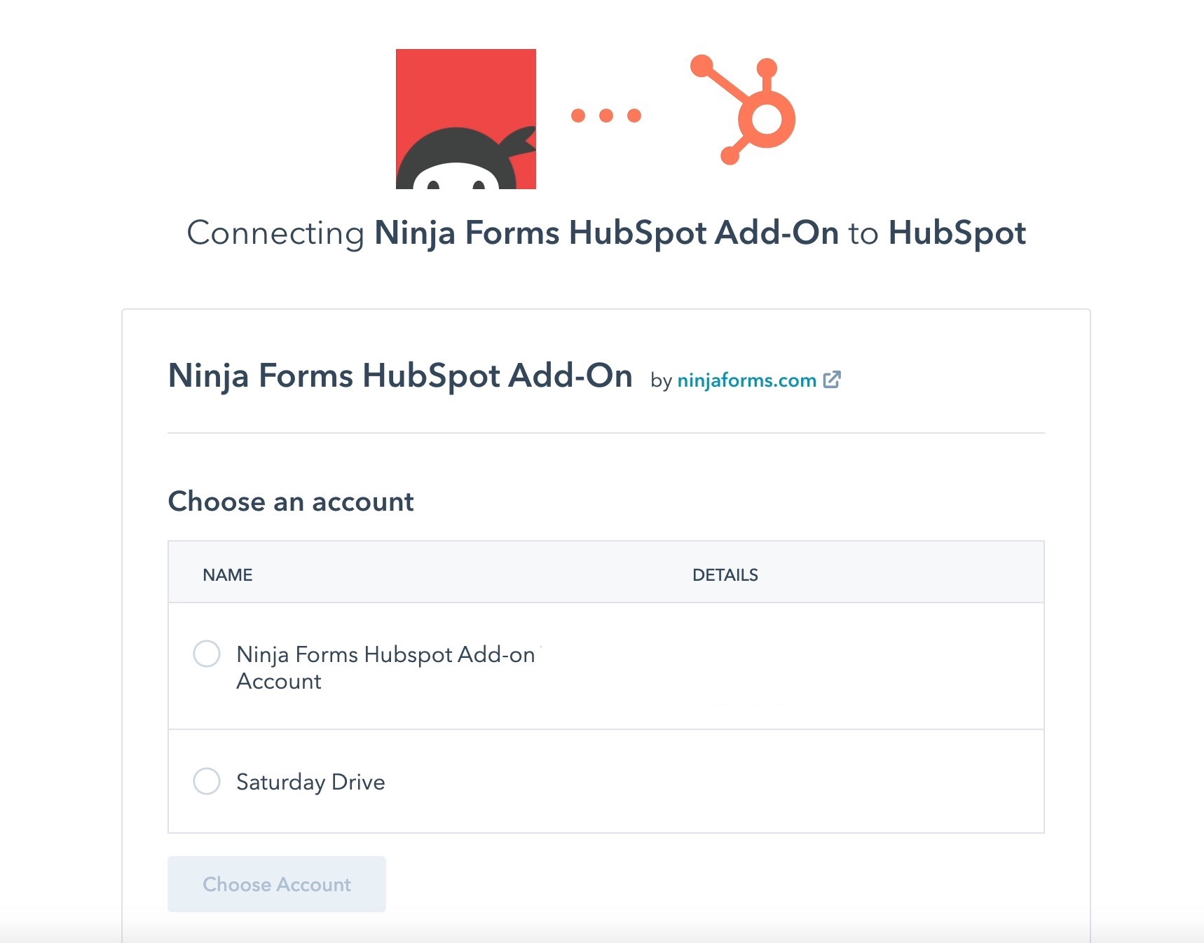 Choose the appropriate HubSpot account you would like to connect to Ninja Forms.