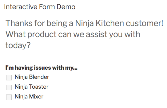 For our demo form, when the user selects a product, the form will ask them what issue they’re experiencing. They can choose from a list of common issues, or indicate that their issue is not covered by that list: