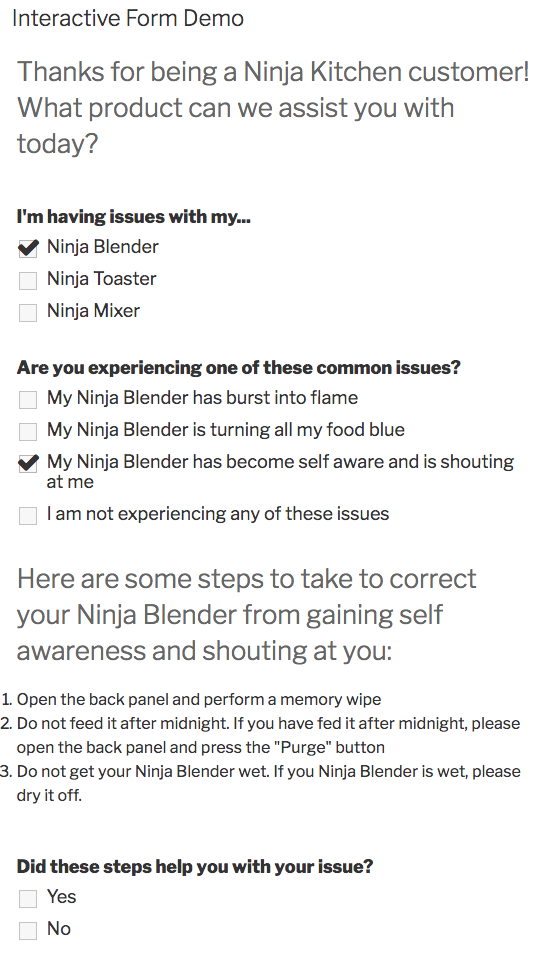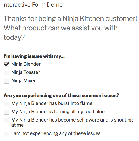 Let’s imagine we’re running a company that offers 3 products: a Ninja Blender, a Ninja Toaster, and a Ninja Mixer. When a user has an issue with one of these products and needs to reach out, we’ve created a support form that will not just allow the user to submit a support request, but runs them through a series of questions to assist them in correcting the issue themselves.