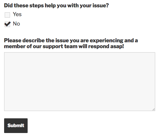 In Step 2, recall that we gave the user an option to indicate that they’re not experiencing a common issue, which would require them to reach out with a description of their issue. If they checked that box then, a Paragraph Text field accompanied by Submit button would appear.