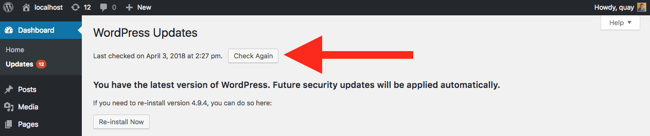 It’s easy to update though- Just pop open your WordPress dashboard and navigate to Dashboard>Updates. Boom. Your WordPress version is right there. Click the “Check Again” button at the top of that page to run a check for more current versions. If it’s still telling you you’re on the current version after that, you’re good. If not, update!