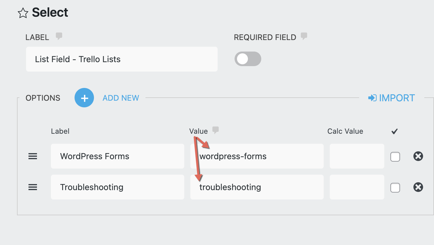 Make sure you have added the values, not just labels to the options fields in your list. Otherwise, you will experience mapping issues with Conditional Logic, so make sure those have been accounted for before you move on,