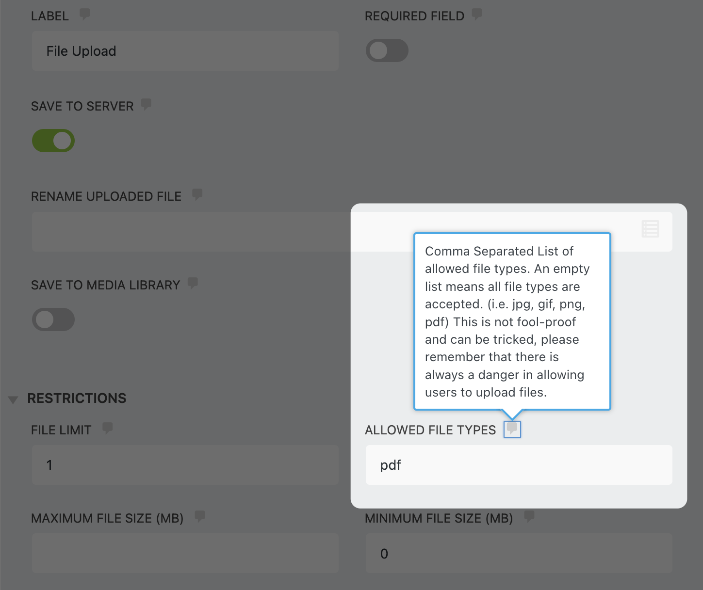 - Restricting the allowed file types and amounts (for example, up to four JPEGs or PDFs)