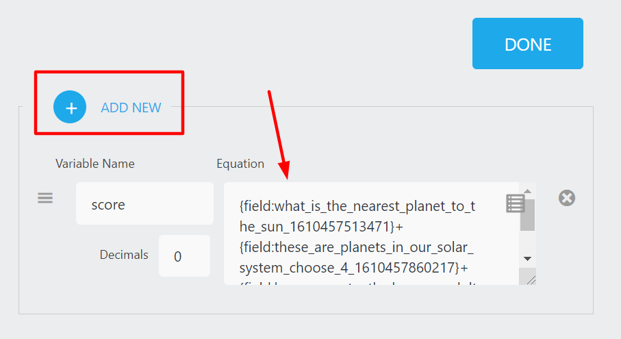 Next, give your equation a variable a name. The variable will run the equation in the background and save the calculated value. After that, enter your list fields one at a time by using the merge tag selector to the right of the Equation field.