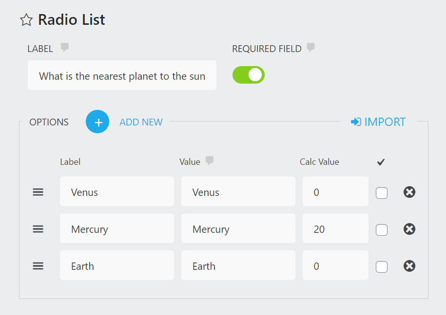 Now that you have added your list fields begin filling them out by adding the quiz questions to the label field and the answers to the options fields. Make sure you include both the label and the value for each option. In Step 2, we will show you how to add numerical values that will allow creating calculations for your quiz.