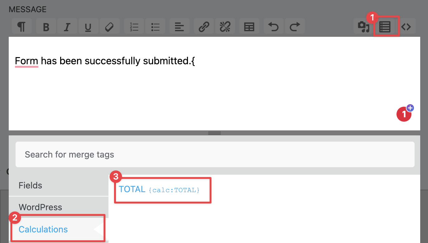 Insert the total by clicking the merge tag icon found to the right of the message field of the action. Click Calculation to reveal the merge tag with your variable name: {calc:variableName} and click on it to add it to the field.