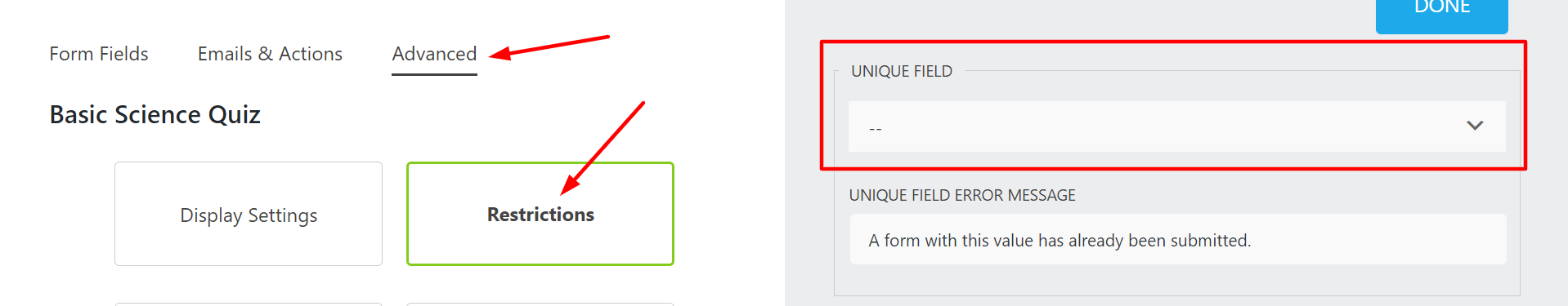 Select the field from the dropdown that you want to make the Unique Field like email. When a user submits the form, it will only accept the submission if the email hasn’t been submitted.