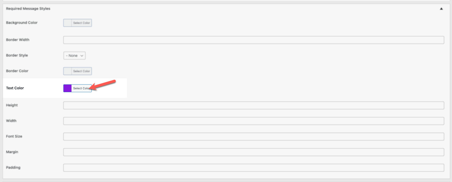 After you’ve installed the Layout and Styles add-on (available individually or as part of our Plus membership), navigate to Styling > Form Styles > Required Message Styles. There, you’ll find the Text Color option where you can select your desired color.