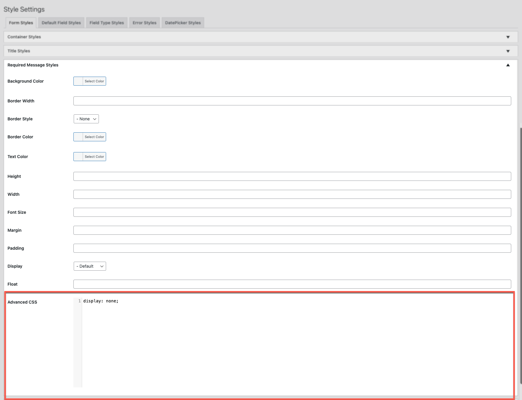 - Or just let Ninja Forms’ Layout and Styles add-on do the heavy lifting. Pop into Styling > Form Styles > Required Message Styles. Flip the ‘Show Advanced CSS properties’ switch, and command it to ‘display: none;‘